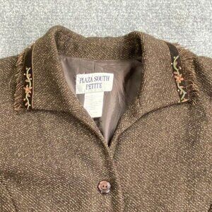 Elevate your wardrobe with this stunning Plaza South jacket in size 12 Petite. Perfect for any occasion, this shacket features a solid brown color and a beautiful embroidered design on collar and sleeves. The jacket is made of a blended fabric of polyester and rayon, with a 100% polyester lining material. Its classic fit and short length jacket/coat length make it a versatile piece for any season - whether it's winter, summer, fall or spring.