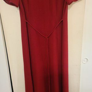 This is Plaza South Petite Ladies Dress. Size 8 Petite. Beautiful red color. It has 2 layers, the outer is sheer, but has an inner lining layer is a solid color (matches the dress color), slightly heavy so it is not see-thru. The inner lining makes the dress hang very nice. Polyester (see picture of tag). The back had a decorative tie/bow (depends on how you want it to look, see pictures) with a decorative metal clamp to keep from fraying (see picture). The front of the dress is pleated and looks really nice. It is Midi length. All buttons on the front are the original and have a shell look to them, they are not plastic. No alterations. There are no rips, tears or stains or fading. The tag (see picture) says to hand wash cold water, but I had it dry cleaned. It wears very nice and very comfortable. It has been in my closet, covered to keep the dust off of it. I take very good care of my clothes. Excellent condition.