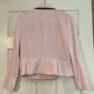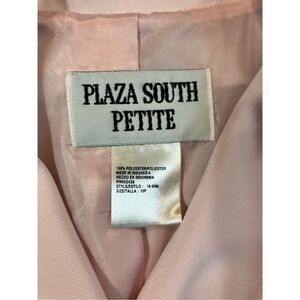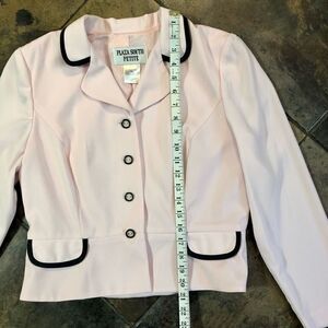 Plaza South Petite Pink Blazer Black Outline 10P. There is a small stain on the back of the cuff. You can see this in the photos. Measurements in photos. In good, pre-loved condition. Comes from a smoke free home.