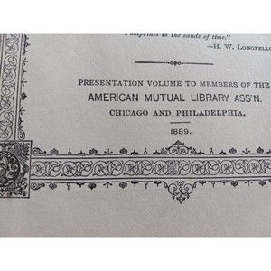 Usual wear for a book of this age, threads can be seen at inside covers, inscription in front. But solid for age. I see NO writing throughout. Very nice vintage book. Copyright is 1885, but this states "Presentation volume to Members of the American Mutual Library Association Chicago and Philadelphia 1889". 408 pages, illustrations throughout. Includes presidents, William Shakespeare, Tennyson, Longfellow, Mark Twain, Dickens, Hugo, Spurgeon, Mozart, Robert E. Lee and many more.