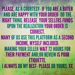 As we all have diff agendas on Posh- many of us myself included, use this as a form of income. As a buyer, if you are happy with the item you received and all is OK-PLEASE do the right thing - release your sellers payment immediately. My average ship time is 1.5 days, longer if I'm under the weather w pancreatitis. I try my BEST at ALL times to make my buyers happy. PLEASE return the same the favor and make your sellers happy as well. It's very difficult having this policy. Thanks so much! Xx