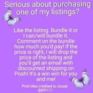 If it is closet clearout this post will be at the top of my closet. During closet clearout I can typically drop my prices lower for liked items. I will only drop the price if the buyer(s) message me. Follow the instructions in the slides to see what price we can agree on. Poshmark provides discounted shipping if the seller reduces the price by 10% but no lower than $10. I'm not likely to discount shipping at this price point either. Got questions, comment on this post. Have a great day!