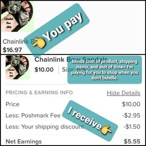 As a buyer and as a seller, I feel the need to share some info. When we offer discounts on shipping, that's money out of our personal pockets. Plus, Poshmark keeps 20% and a $3 minimum on every sale plus taxes for the state, so if it's $5, for example. You spend $13 and expect $13 worth. Now we the poshers have to give the item we paid for, box it, ship it, make it worth your ti.e and money so hopefully you dont give a por review and won't see a dime. I will actually come out of pocket for you, and I'm not complaining. I just want others to understand both sides like I do because I didn't at first as a buyer. Please bundle. Thank you for your time
