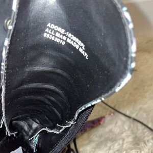 These have no size on them but fit like a size 6. Someone who gave these to me was too big for them, hence why they are ripped. Minor chipping underneath shoe, otherwise, the rest of the shoes are in decent condition. These need repair and some love, but I did wear these while damaged and had no issues. Please use your own discretion as there are no cancellations/returns/refunds. See all pictures. Sold as is as shown. The shoe is a dim greyish tone but light up in certain lighting(reflective) as shown in pictures with the flash on. Cat friendly home. Thank you for looking.