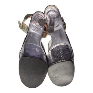 Clear vinyl sandals with a buckling strap, a 7" lucite spike heel, and 2.5" platform filled with iridescent black glitter, from Pleaser.