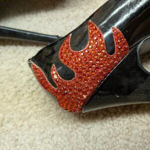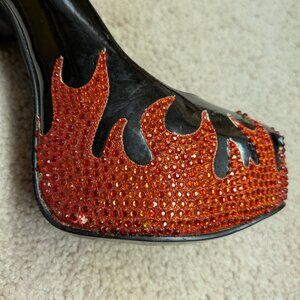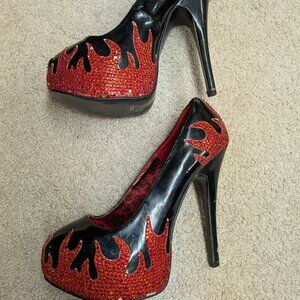Pleaser Bordello TEEZE-27, 5 3/4" Concealed Platform Pump With Rhinestone Flames. Black and red. Size 8.