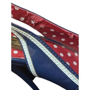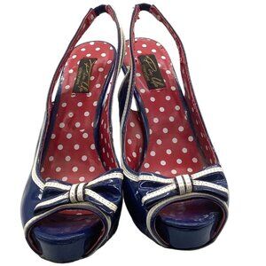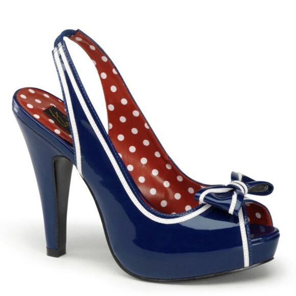 Classic nautical-inspired pin-up style sling-back peep-toe platform pumps.