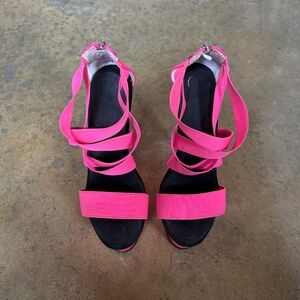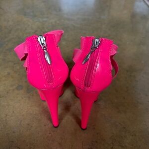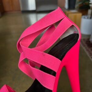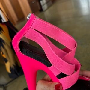 Pleaser heels, 7in. Fabric elastic straps, much more comfortable than the plastic ones in my opinion. These glow under UV light! Used but life left in them. Pics show some minor stains on straps. I used ball of foot gel pads on them for a long time so that area shows less wear.