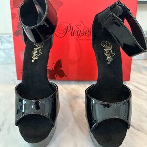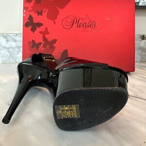 Pleaser heels, patent leather, platform, back zip, elastic ankle band, New without box: This item is brand new and has never been used, but doesn’t have tags and/or is missing the original packaging. The item doesn’t have flaws or imperfections. The Pleaser heels in size 8 feature an open toe design with a platform style and ultra high heel. Made of patent leather in black, these shoes have a back zip closure and elastic ankle band for added comfort and security. Perfect for adding a touch of glamour to any outfit, these heels are designed for women who want to make a bold fashion statement. The Pleaser brand is known for its quality and style, making these heels a popular choice for those looking to elevate their footwear collection. NEVER WORN. STRIPPER HEELS.