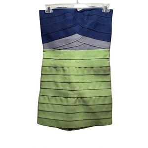 Pleasure Doing Business color-block bandage mini dress. This strapless dress features horizontal stripes in navy blue, gray, and shades of green. It is made from a stretchy bandage fabric, typically a blend of polyester, nylon, and spandex, which is designed to tightly hug the body. The dress has an exposed back zipper and is approximately 27 inches in length. Bandage dresses are known for their body-conforming fit and are often worn for evenings out or special occasions