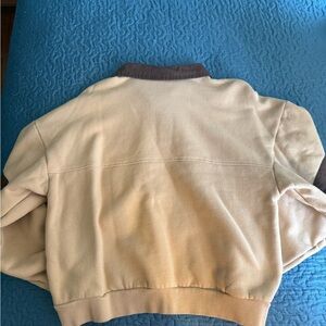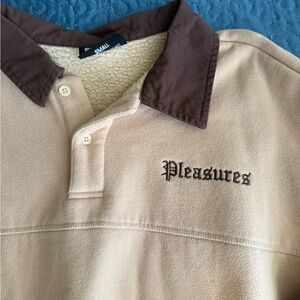 Pleasures collared rugby sweater with elbow patches and fleece inside. Boxy, cropped fit