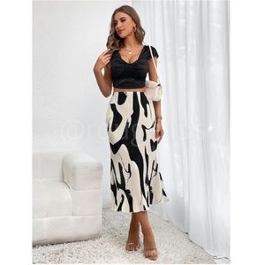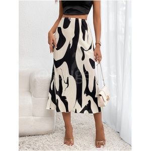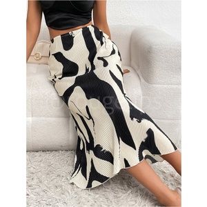 Pleated Black on Off White/Cream Midi Skirt Graphic Print