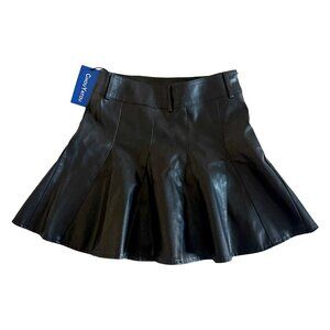 This sleek black faux-leather pleated skort is perfect for dressing up or adding an edgy touch to any outfit. Features a flattering flared silhouette with built-in shorts for comfort and coverage.