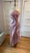 Unbranded Pleated Halter Midi Dress with Cascading Ruffle Details. Sleeveless, a line silhouette, asymmetric length, fully lined, concealed side zipper closure. Dramatic ruffles and pleating detail, long maxi length. 100% polyester.