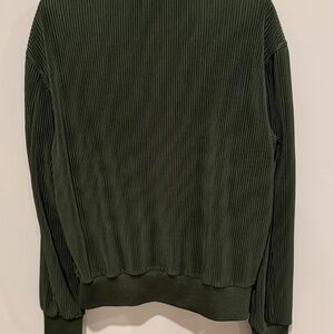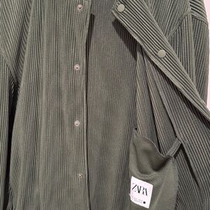 This men’s pleated olive green bomber jacket is also suitable for women. It is a great travel or work piece. It has two cozy pockets in the front and snap closures.
