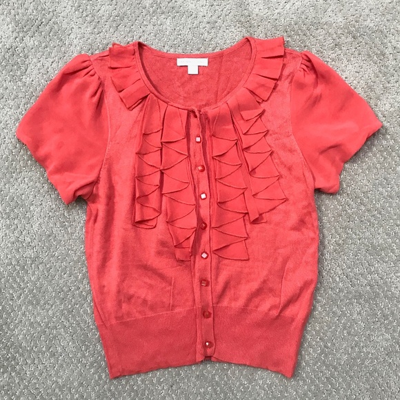 Vivid coral colour.. Can be worn buttoned up as a shirt or as a cardigan. Floaty tee sleeves are made of the same material as the ruffles. Unlike other ruffled garments, these are flat pleated, so there's no additional / unflattering volume which is fantastic (I always feel like a puffed up pigeon in most ruffle-chested things...not this!!!)