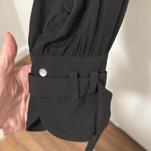 Pleated silk peplum long sleeve blouse in black. Features round neckline, pleated bodice, peplum bottom with center slit, long balloon sleeve with white snap closure and tie. Back zipper closure.