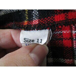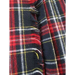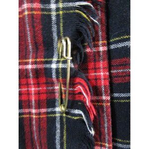 Chic vintage wool tartan plaid wrap skirt. Features brass pin, fringed side, ILGWU Tag, knife pleats, and black, red, white, and yellow tartan pattern. No holes or manufacturer's label present. Button waist.