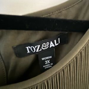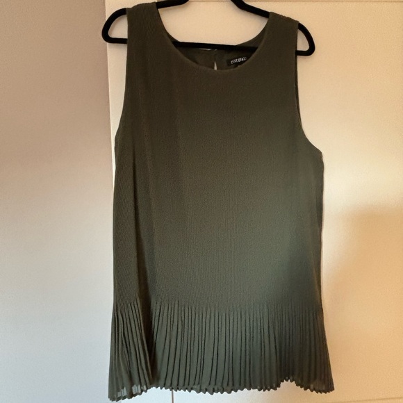 Top is a beautiful olive color. Top is pleated, lined & sleeveless. It’s beautiful on it flows so nice.
