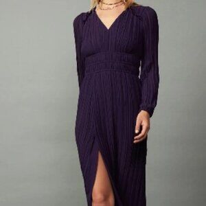 Dainty pleats glide against the body and add to the movement of this subtly sheer V-neck midi dress. It's accented by ruffle trim at the shoulders and drawn in by an elasticized waist, falling to a subtle high-low hem with a front slit and a lettuce edge. Take a peek at the back: there's a sweet little tie that hits just under the nape of the neck.