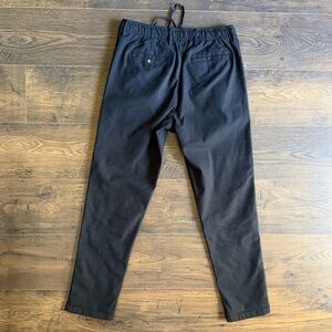 Pleated black pants with drawstring. Straight tapered fit measuring 30x32”