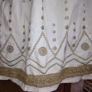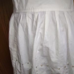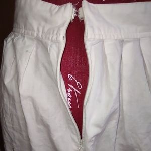 White cotton skirt with a pleated waistline. Lace accent at the bottom with embroidery accenting that. Zipper and hook closure in the back. 13 inches laying flat at the waist 18 inches from top to bottom. DSBIN1