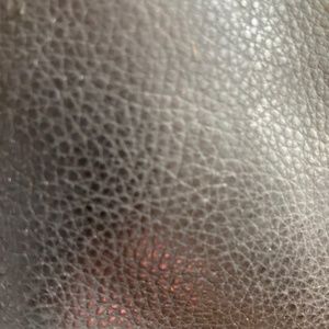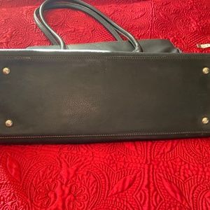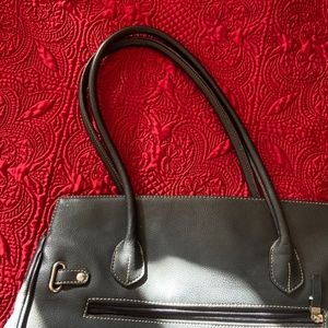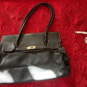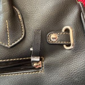 2 magnet closure and lined with nylon with mid zip compartment and side zip on one interior side and two pencil pockets on the other. Side gathered closure. Back outer zip compartment. Excellent rich expensive looking details. Great condition. A little dirty. Bottom has four steel nails to keep bottom from getting dirty. Snap closure.