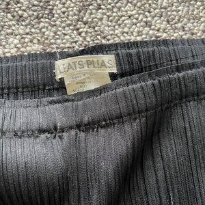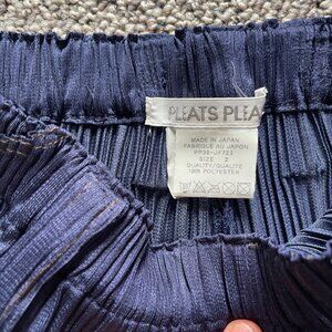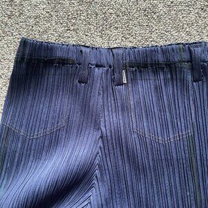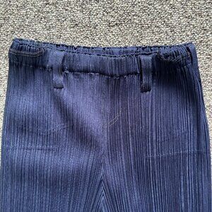 Lot of 2 pants from Pleats Please by Issey Miyake. Made in Japan. Both are size 2 (please see attached picture for Pleats Please sizes). Signature pleated stretchy style. The navy one has a faux “denim” look with belt loops and “pockets”. Both in excellent condition.