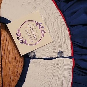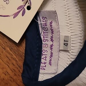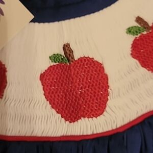 NWT Pleats & Stitches smocked girls toddler dress. Blue and white with red apple embroidery design. Ruffle pleated short cap sleeves with red ric rac trim. 3 clear buttons on the back with 1 extra attached to the tag.