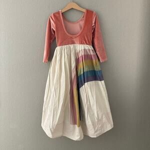 Beautiful high low full skirt with fitted velour ballet style upper, scoop back. Pockets. Made in USA. May be earthy rainbow.