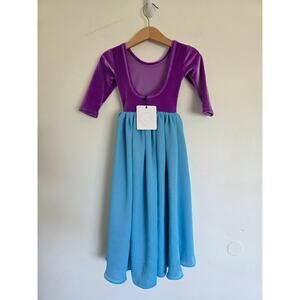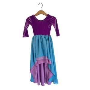 Purple velvet bodice with high-low chiffon layers in blue and purples