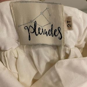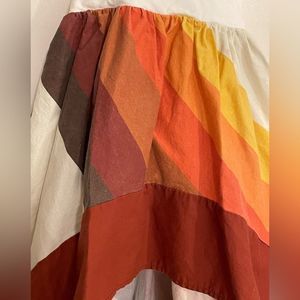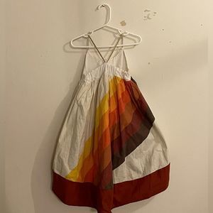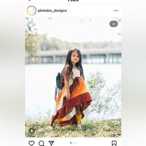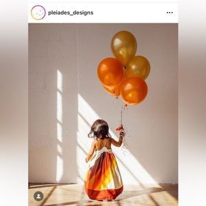 Pleiades Windsong Dress Size: 2T Color: Pumpkin Spice VGUC Stunning Pleiades dress is hard to find. These dresses are magical! Spaghetti straps are made of braided gold leather. Elasticized backing for flexible fit. Empire waist and hi-lo skirt. Features a beautiful autumn rainbow and burgundy border at hem. Made of vintage material the rainbow does show slight wash wear. No rips, stains or tears.