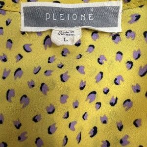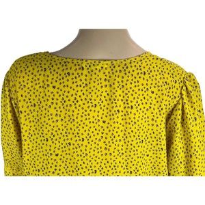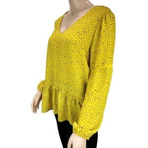 Pleione for Anthropologie semi-sheer, long puff sleeve top, yellow with purple dots. Sz LARGE. Crochet Trim on the arms, ruffle hem, v neck. polyester. Measurements (laid flat to measure): Bust (armpit-armpit): 22, shoulder to shoulder: 15.5, Sleeves (shoulder seam-cuff): 25, Length (back): 25.5.