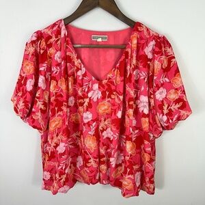 Pleione Blouse Women L Pink Floral V-Neck Puff Sleeve Boho Coquette Romantic
