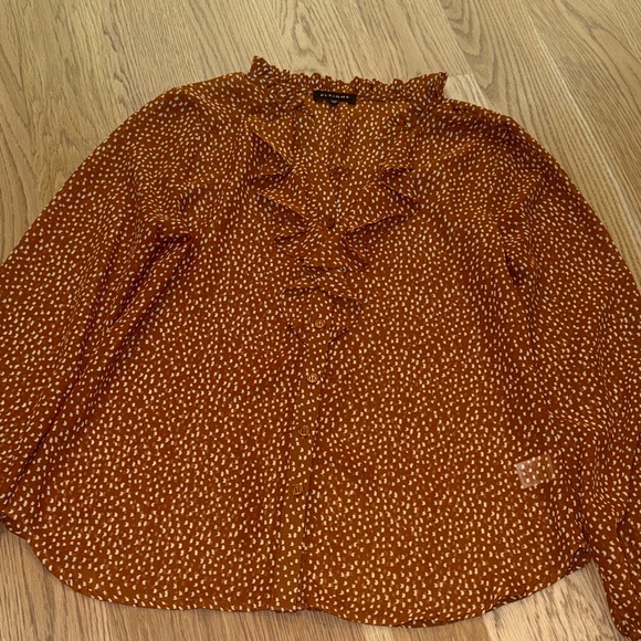 Pleione Brown Patterned Ruffle Blouse