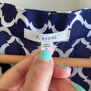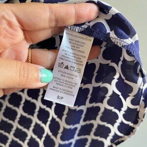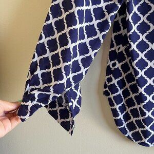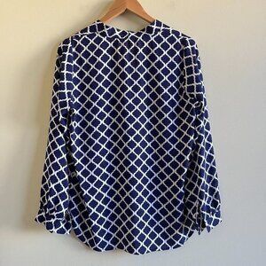 Pleione Button-Down Top Women’s Size Small Navy Blue White Moroccan Lattice Print, 100% Polyester