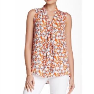 Pleione Crepe Tie Neck Tunic Blouse Orange Floral Sleeveless Womens Small