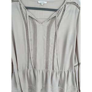 Pleione Crochet Accent Peplum Blouse Womens Large Tan Beige Tie Neck
