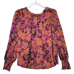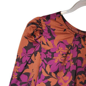 Pleione Floral Silky Blouse Scoop Neck Long Sleeve Purple Orange Black Top Large