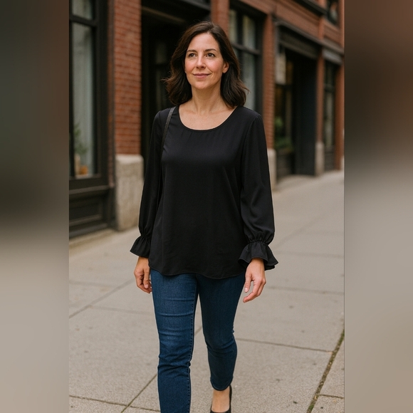 Pleione Medium Black Blouse with Ruffle Sleeves Light Weight Sheer Minimalist