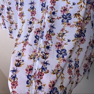 Pleione Peasant Floral Blue Pink Top Medium. Preowned and in great condition. Very light weight, ties at neck, bell sleeves. 100% polyester