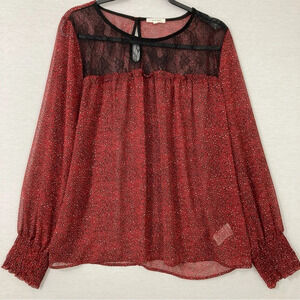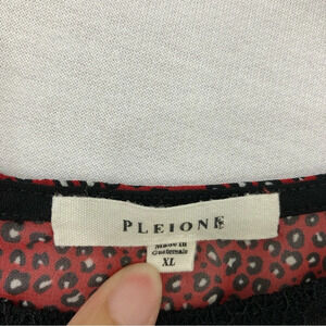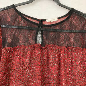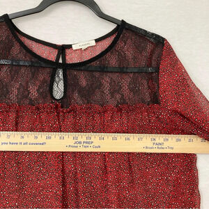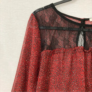 Pleione Red Black Leopard Print Lace Round Neck Sheer Blouse XL