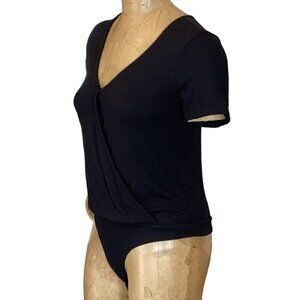 Pleione Short Sleeve V-Neck Bodysuit Top S Stretch Ribbed Knit Black 284G