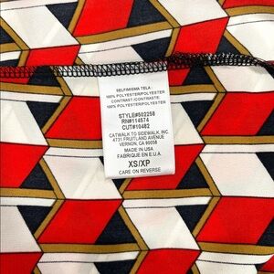 Sleeveless blouse with tie at one shoulder. Red, white, black and bronze geometric print.