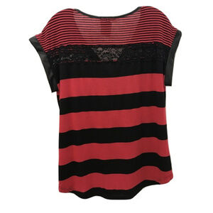 Pleione red and black striped blouse with sheer lace, retail $68, Size M