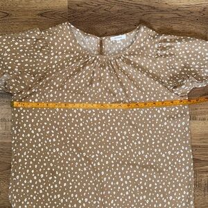This relaxed blouse by Pleione showcases short puff sleeves and a charming ruffled design. The tan base is elegantly complemented by white accents, offering a soft and airy aesthetic. Ideal for a casual yet polished look.