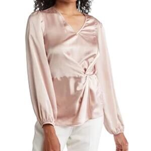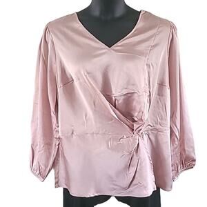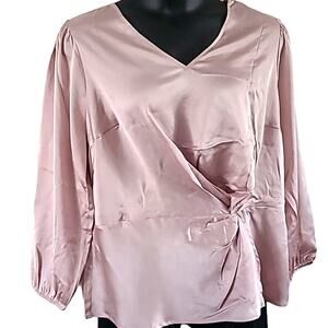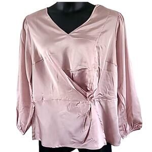 Pleione blouse, twist-front satin blouse, mauve long sleeve top, elegant women’s blouse, silky dressy top, plus-size satin top, V-neck twist blouse, chic evening wear, lightweight flowy blouse, workwear fashion, polished casual top, stylish dress blouse, special occasion top, sophisticated satin blouse, feminine business casual fashion.