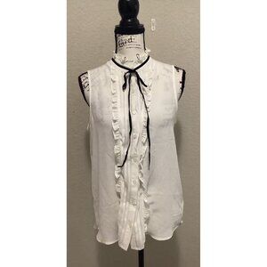 Pleione White Sleeveless Button-Down Blouse W/Ruffle Trim & Black Ribbon