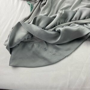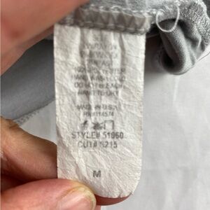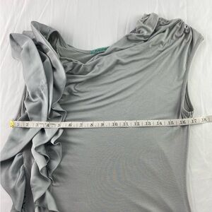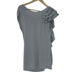 Pleione gray ruffled shoulder & side stretch top is women's size medium. Has some pulled strings in the ruffle that are not noticeable unless you open them to look. See photos for details and measurements.
