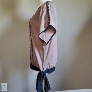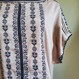 This Pleione short sleeve embroidered top reminds of clothing out of the 20's and 30's. The shape is simple, but the embroidery down the front and sleeves is beautiful, the sleeves are trimmed, as in the hem with a gathered back hem and hanging side bow. This top is is excellent condition. It does not have tags, but it looks new to me. Size Small.